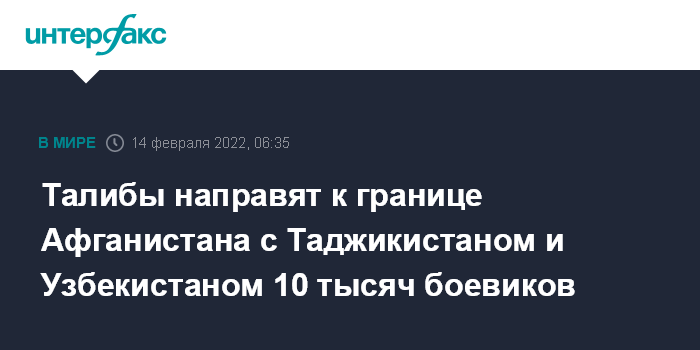 Москва. 14 февраля. INTERFAX.RU - Контролирующее Афганистан движение "Талибан" (запрещенная в РФ террористическая организация) направляет в граничащие с Таджикистаном и Узбекистаном провинции 10 тысяч вооруженных современными оружием и техникой боевиков, заявил в понедельник начальник генштаба вооруженных сил талибов Кари Фасихуддин Фитрат.