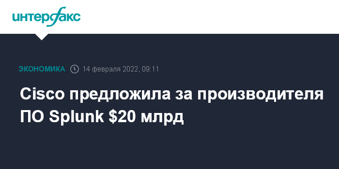 Москва. 14 февраля. INTERFAX.RU - Cisco Systems Inc. сделала предложение американскому производителю программного обеспечения Splunk Inc. купить его более чем за $20 млрд, пишет The Wall Street Journal со ссылкой на источники.