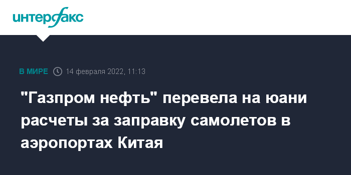 Москва. 14 февраля. INTERFAX.RU - "Газпром нефть" полностью перевела в юани взаиморасчеты при заправке рейсов российских авиакомпаний на территории Китая, сообщила компания.