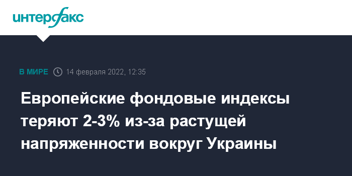 Москва. 14 февраля. INTERFAX.RU - Европейские рынки акций резко снижаются в понедельник в связи с растущей напряженностью вокруг Украины.