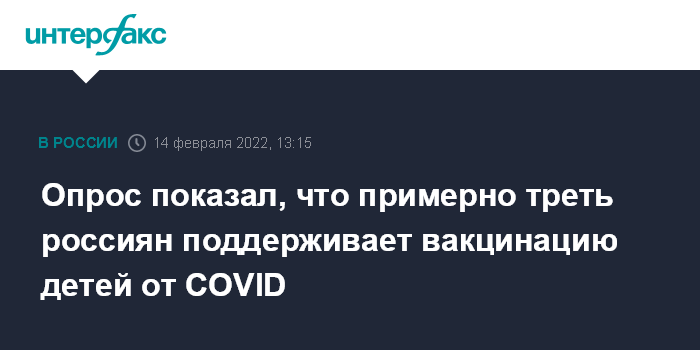 Москва. 14 февраля. INTERFAX.RU - Вакцинацию детей от коронавируса поддерживает примерно треть россиян, сообщили в Российской академии народного хозяйства и государственной службы при президенте РФ по итогам проведенного опроса.