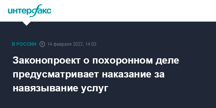 Москва. 14 февраля. INTERFAX.RU - Законопроект о похоронном деле содержит норму, предусматривающую наказание за навязывание услуг родственникам умерших, сообщила депутат Госдумы РФ Светлана Разворотнева.