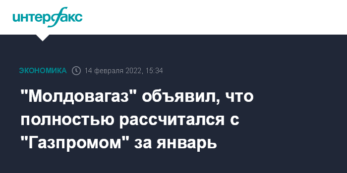 Москва. 14 февраля. INTERFAX.RU - "Молдовагаз" полностью рассчитался с "Газпромом" за январь, сообщил председатель правления молдавской компании Вадим Чебан в своем телеграмм-канале в понедельник.