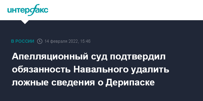 Москва. 14 февраля. INTERFAX.RU - Девятый арбитражный апелляционный суд признал законным решение о признании не соответствующими действительности сведений, распространенных Алексеем Навальным о бизнесмене Олеге Дерипаске.