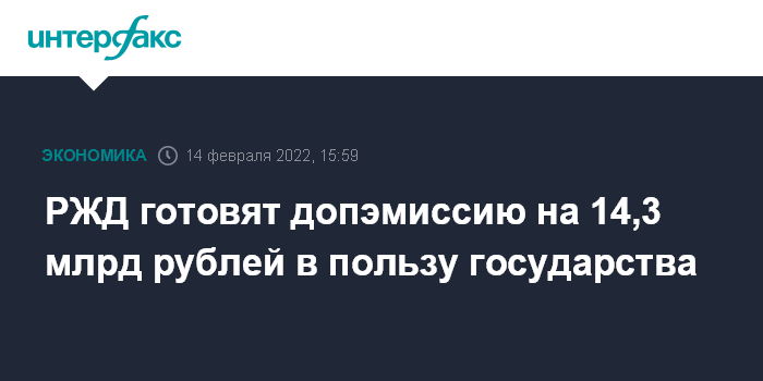 РЖД готовят допэмиссию на 14,3 млрд рублей в пользу государства