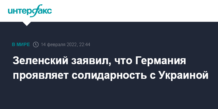 Москва. 14 февраля. INTERFAX.RU - Украина и Германия едины в позиции небезопасности эскалации на украинско-российской границе для Европы и мира, несмотря на разные взгляды на определенные проблемы, заявил президент Владимир Зеленский.