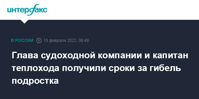 Москва. 15 февраля. INTERFAX.RU - В Томской области Александровский районный суд назначил реальные сроки в колонии бывшему директору судоходной компании ООО "Совкомфлот-8" и его подчиненного - капитана теплохода "Ангара-888" - по делу о гибели подростка в мае 2020 года, сообщили в Восточном межрегиональном управлении СК на транспорте.