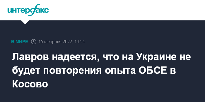 Москва. 15 февраля. INTERFAX.RU - Глава МИД РФ Сергей Лавров выразил надежду на то, что отзыв рядом стран своих представителей из специальной мониторинговой миссии (СММ) ОБСЕ на Украине связан с пандемией и отпусками и не станет "спусковым крючком" к агрессии; он также заявил, что не хотел бы видеть на Украине повторения опыта ОБСЕ в Косово.