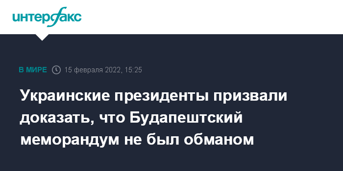 Москва. 15 февраля. INTERFAX.RU - Три президента Украины - Леонид Кравчук, Леонид Кучма, Виктор Ющенко - призывают подписантов Будапештского меморандума доказать, что документ "не был простым обманом".