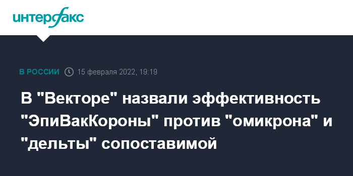 Москва. 15 февраля. INTERFAX.RU - Вакцина от коронавируса "ЭпиВакКорона" эффективна против "омикрона", защита после вакцинации против этого штамма сопоставима с защитой от "дельты", сообщили "Интерфаксу" в ГНЦ "Вектор", который разработал вакцину.