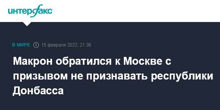 Москва. 15 февраля. INTERFAX.RU - Президент Франции Эммануэль Макрон призвал российское руководство не признавать самопровозглашенные Донецкую и Луганскую народные республики (ДНР и ЛНР).