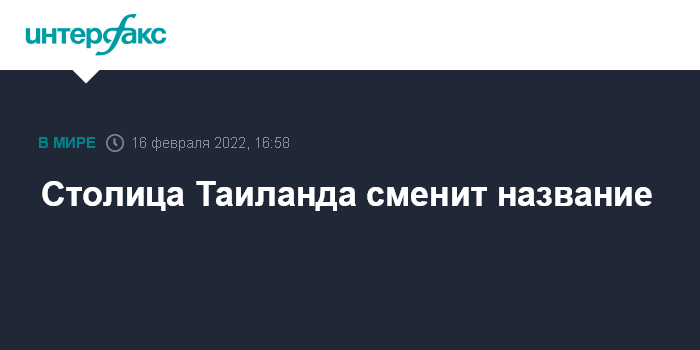 Москва. 16 февраля. INTERFAX.RU - Офис Королевского общества Таиланда (ORST) объявил, что город Бангкок будет переименован в Крунг Тхеп Маха Накхон, на тайском языке это означает "Город Ангелов Великая Столица", пишет Bangkok Post.
