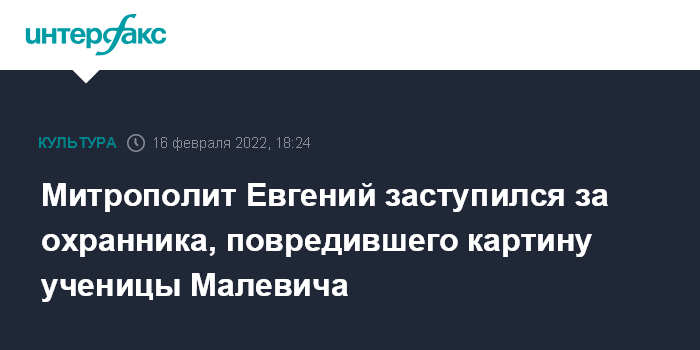 Москва. 16 февраля. INTERFAX.RU - Митрополит Екатеринбургский и Верхотурский Евгений поддержал позицию губернатора Свердловской области Евгения Куйвашева, призвавшего не наказывать строго охранника, который повредил в "Ельцин-Центре" картину ученицы Малевича Анны Лепорской.