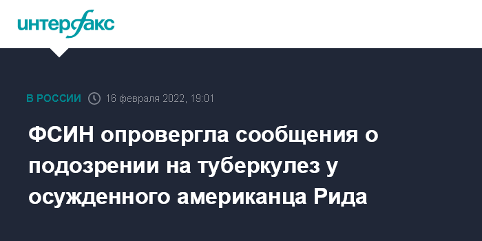 Москва. 16 февраля. INTERFAX.RU - Федеральная служба исполнения наказаний (ФСИН) опровергла данные правозащитников о возможном заболевании туберкулезом осужденного американца Тревора Рида.