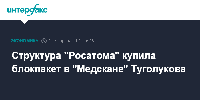 Москва. 17 февраля. INTERFAX.RU - Структура госкорпорации "Росатом" - "Русатом Хэлскеа" - приобрела 25,001% группы "Медскан", сообщил Forbes со ссылкой на основателя компании Евгения Туголукова.