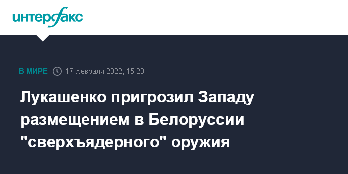 Москва. 17 февраля. INTERFAX.RU - Ядерное оружие может быть размещено в Белоруссии, и власти страны пойдут на этот шаг, но только в случае угроз со стороны Запада, заявил президент республики Александр Лукашенко после ознакомления с ходом белорусско-российского учения "Союзная решимость-2022" на полигоне Осиповичский.