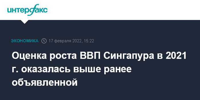 Москва. 17 февраля. INTERFAX.RU - Рост экономики Сингапура по итогам всего 2021 года был пересмотрен до 7,6% с ранее объявленных 7,2%. В 2020 году ВВП Сингапура снизился на 4,1%. Правительство страны прогнозирует в 2022 году увеличение экономики в диапазоне 3-5%.