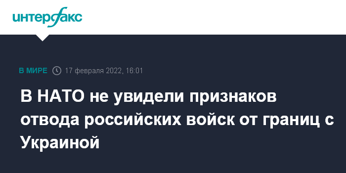 Москва. 17 февраля. INTERFAX.RU - В НАТО по-прежнему не видят признаков отвода войск РФ от Украины и продолжают следить за обстановкой вокруг границы, заявил в четверг на пресс-конференции генсек альянса Йенс Столтенберг.