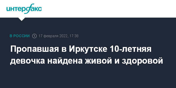 Москва. 17 февраля. INTERFAX.RU - В Иркутске найдена девочка, которая в четверг днем ушла из магазина на улице Советской и не пришла домой.