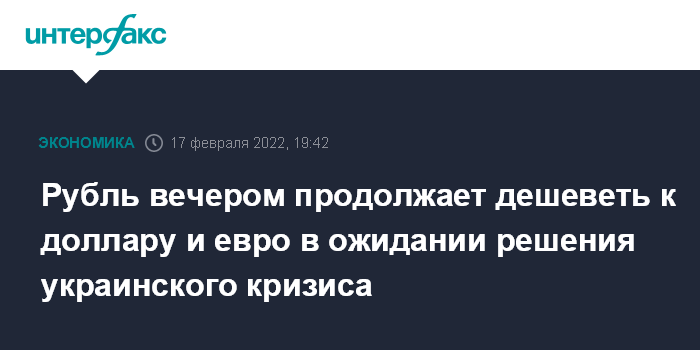 Как отмечают эксперты "Интерфакс-ЦЭА", рубль дешевеет к доллару и евро на фоне кризисной ситуации вокруг Украины и опасений перерастания конфликта в полномасштабные военные действия. В последние недели США, другие страны НАТО и Киев неоднократно заявляли о концентрации войск РФ у границы с Украиной и угрозе "российского вторжения". Россия последовательно опровергала эти утверждения.
