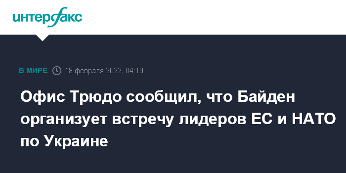 Москва. 18 февраля. INTERFAX.RU - Президент США Джо Байден организует встречу с главами стран ЕС и НАТО для обсуждения ситуации вокруг Украины, сообщает офис премьер-министра Канады.