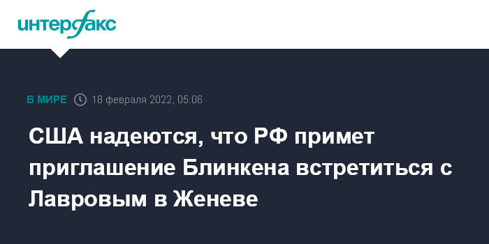 Москва. 18 февраля. INTERFAX.RU - США надеются, что Россия положительно отреагирует на предложение госсекретаря США Энтони Блинкена встретиться с главой МИД РФ Сергеем Лавровым в Женеве на следующей неделе, заявила постпред США при ООН Линда Томас-Гринфилд.