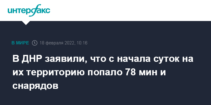Москва. 18 февраля. INTERFAX.RU - С начала суток 78 мин и снарядов выпущено по территории самопровозглашенной Донецкой народной республики, сообщает представительство ДНР в совместном центре контроля и координации режима прекращения огня (СЦКК).
