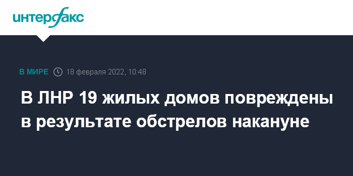 Москва. 18 февраля. INTERFAX.RU - 19 жилых домов получили повреждения в минувший четверг в результате обстрелов территории самопровоглашенной Луганской народной республики со стороны вооруженных сил Украины, сообщила пресс-служба Народной милиции ЛНР.