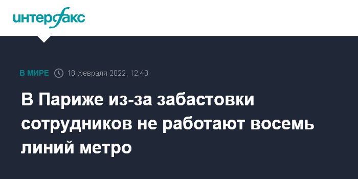 Москва. 18 февраля. INTERFAX.RU - Сотрудники компании RATP, управляющей общественным транспортом Парижа и его пригородов, в пятницу проводят масштабную забастовку, закрыто восемь линий метрополитена, сообщают французские СМИ.