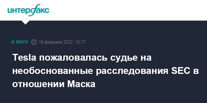 Москва. 18 февраля. INTERFAX.RU - Американский производитель электромобилей Tesla Inc обвинил Комиссию по ценным бумагам и биржам (SEC) в преследовании ее главы Илона Маска и проведении необоснованных расследований относительно выполнения компанией условий заключенного с регулятором соглашения.