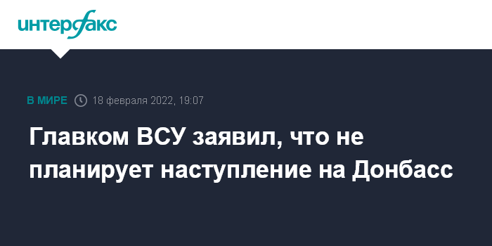 Москва. 18 февраля. INTERFAX.RU - Главнокомандующий Вооруженными силами Украины Валерий Залужный назвал слухами сообщения о том, что украинская армия планирует напасть на неподконтрольные Киеву районы Донецкой и Луганской областей.