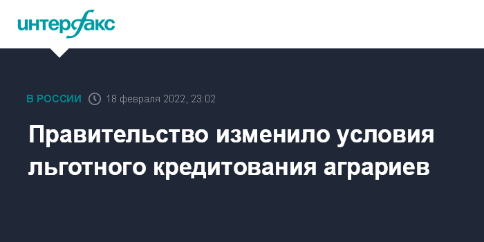 Москва. 18 февраля. INTERFAX.RU - Премьер-министр Михаил Мишустин 15 февраля подписал постановление правительства об изменении условий льготного кредитования агропромышленного комплекса. Документ размещен на официальном портале правовой информации.