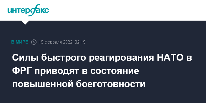 Москва. 19 февраля. INTERFAX.RU - Войска Германии, входящие в состав сил быстрого реагирования НАТО, будут приведены в состояние повышенной боевой готовности, что сократит сроки их развертывания для защиты восточноевропейских союзников в случае эскалации напряженности в отношениях с Россией, сообщило в пятницу Минобороны ФРГ.