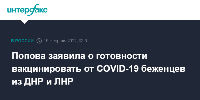 Москва. 19 февраля. INTERFAX.RU - Запасов вакцины от COVID-19 в Ростовской области и на федеральных базах достаточный для проведения вакцинации беженцев из самопровозглашенных ДНР и ЛНР, сообщила глава Роспотребнадзора Анна Попова.