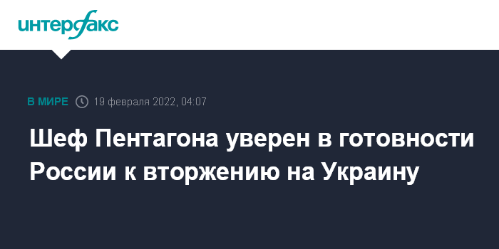 Москва. 19 февраля. INTERFAX.RU - Министр обороны США Ллойд Остин считает, что Россия уже готова к вторжению на Украину в недалеком будущем.