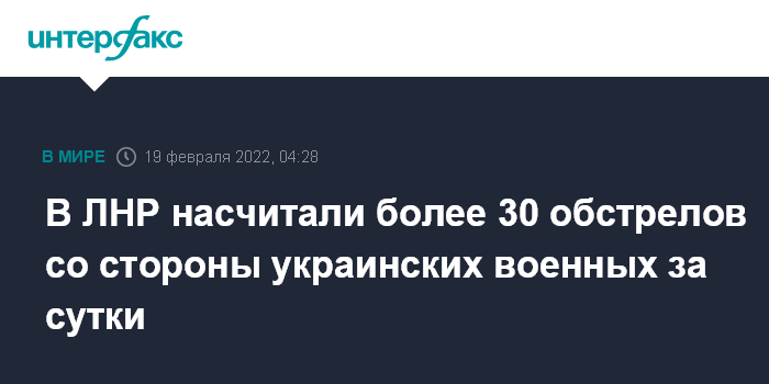 Москва. 19 февраля. INTERFAX.RU - Вооруженные силы Украины 31 раз за прошедшие сутки обстреляли территорию самопровозглашенной Луганской народной республики, сообщили "Интерфаксу" в представительстве ЛНР в Совместном центре по контролю и координации режима прекращения огня (СЦКК).