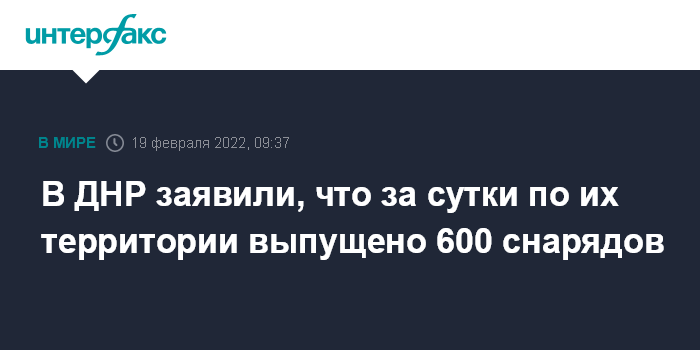 Москва. 19 февраля. INTERFAX.RU - Около 600 снарядов выпущено по ДНР за прошлые сутки, заявил "Интерфаксу" в субботу представитель Народной милиции самопровозглашенной Донецкой народной республики Эдуард Басурин.
