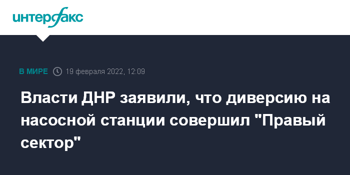 Москва. 19 февраля. INTERFAX.RU - Представитель Народной милиции самопровозглашенной Донецкой народной республики Эдуард Басурин заявил, что диверсию на насосной станции, в результате которой без воды могут остаться почти 2 млн человек, совершила диверсионная группа из числа украинских националистов.