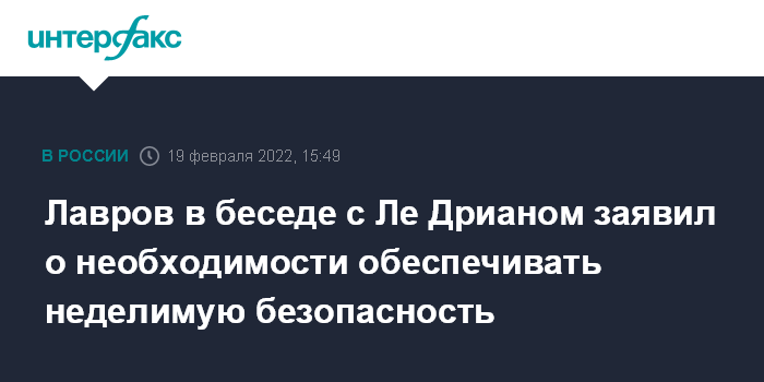 Москва. 19 февраля. INTERFAX.RU - Министр иностранных дел России Сергей Лавров в ходе телефонного разговора с французским коллегой Жан-Ивом Ле Дрианом заявил о необходимости соблюдения всеми государствами обязательств по обеспечению равной и неделимой безопасности.