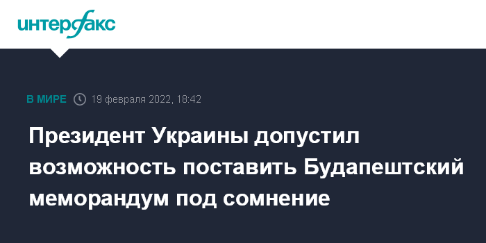 Москва. 19 февраля. INTERFAX.RU - Президент Украины Владимир Зеленский инициировал проведение консультаций в рамках Будапештского меморандума, однако если они не состоятся или по их результатам не будут приняты конкретные решения по гарантиям безопасности для Украины, то Киев может поставить обязательства стран-гарантов под сомнение.