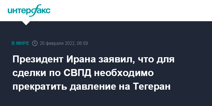 Москва. 20 февраля. INTERFAX.RU - Президент Ирана Ибрахим Раиси считает недопустимым давление, которое оказывается на Иран в процессе венских переговоров по восстановлению Совместного всеобъемлющего плана действий (СВПД), оно может привести к срыву возможных договоренностей.