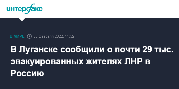 Москва. 20 февраля. INTERFAX.RU - Почти 29 тыс. жителей самопровозглашенной Луганской народной республики эвакуированы в Россию, сообщили в воскресенье журналистам в штабе территориальной обороны ЛНР.