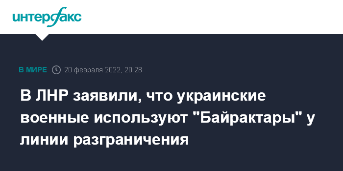 Москва. 20 февраля. INTERFAX.RU - Народная милиция самопровозглашенной Луганской народной республики фиксирует применение Вооруженными силами Украины турецких беспилотников "Байрактар" для ведения разведки в Донбассе, сообщил представитель военного ведомства ЛНР Иван Филипоненко.