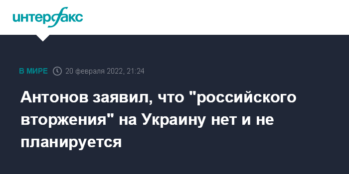 "Хотел бы в очередной раз подчеркнуть: в нашей письменной реакции на ответ американской стороне по гарантиям безопасности, переданной 17 февраля, недвусмысленно сказано: никакого "российского вторжения" на Украину, о чем с осени прошлого года заявляют на официальном уровне США и их союзники, нет и не планируется. Утверждения об ответственности России за эскалацию нельзя расценить иначе как попытку оказать давление и обесценить предложения России по гарантиям безопасности", - написал Антонов на странице российского посольства в США в соцсети Facebook, комментируя вопросы, прозвучавшие от ведущей вовремя его интервью американскому телеканалу CBS.