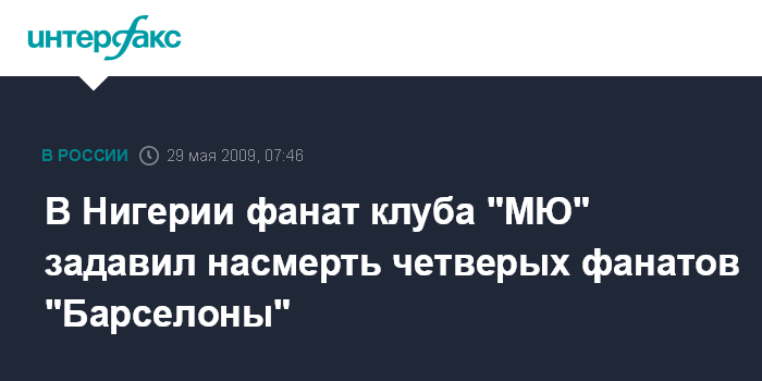 Лондон. 29 мая. ИНТЕРФАКС - Фанат футбольного клуба "Манчестер Юнайтед", опечаленный неудачей своего клуба в финале Лиги Чемпионов, задавил насмерть четверых фанатов "Барселоны" в городе Огбо на юго-востоке Нигерии, сообщила британская телерадиокорпорация Би-би-си.
