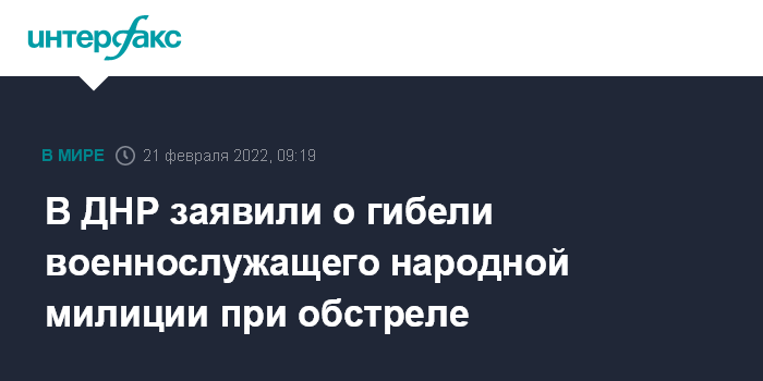 Москва. 21 февраля. INTERFAX.RU - В самопровозглашенной Донецкой народной республике в результате обстрела погиб один военнослужащий народной милиции, еще один был тяжело ранен, еще двое получили контузию, сообщило управление народной милиции ДНР.