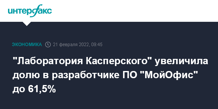 Москва. 21 февраля. INTERFAX.RU - "Лаборатория Касперского" увеличила долю в российском разработчике офисного софта "Новые облачные технологии" (НОТ, разработчик линейки офисного ПО "МойОфис") до 61,5% с 47%, следует из данных аналитической системы "СПАРК-Интерфакс".