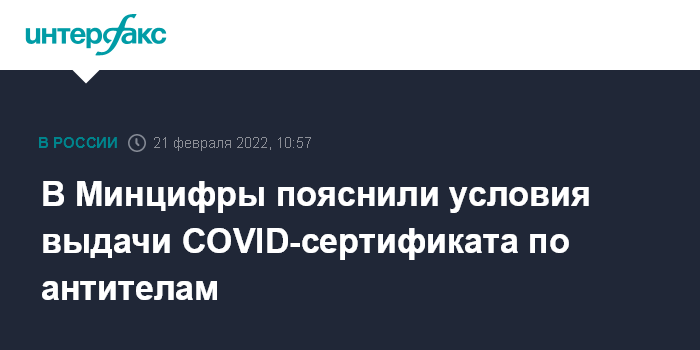 Москва. 21 февраля. INTERFAX.RU - COVID-сертификаты о перенесенном заболевании по уровню антител можно получить только один раз и в случае, если ранее документов о болезни или вакцинации не выдавалось, сообщили в Минцифры.