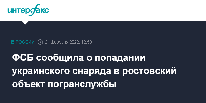 Москва. 21 февраля. INTERFAX.RU - Снаряд, запущенный с территории Украины, 21 февраля утром полностью разрушил место несения службы пограничников в Ростовской области вблизи от госграницы, никто не пострадал, сообщили "Интерфаксу" в Центре общественных связей ФСБ России.