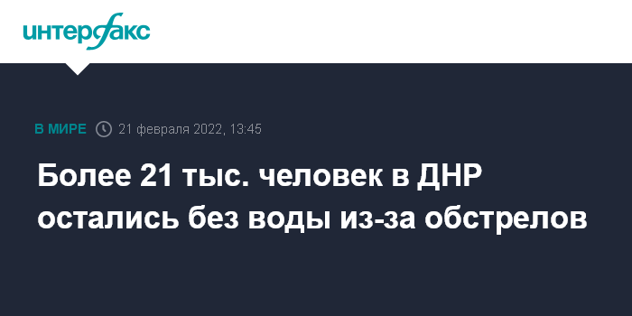 Москва. 21 февраля. INTERFAX.RU - Из-за обстрелов без питьевой воды в ДНР остались более 21 тысячи человек, сообщает МЧС самопровозглашенной Донецкой народной республики.